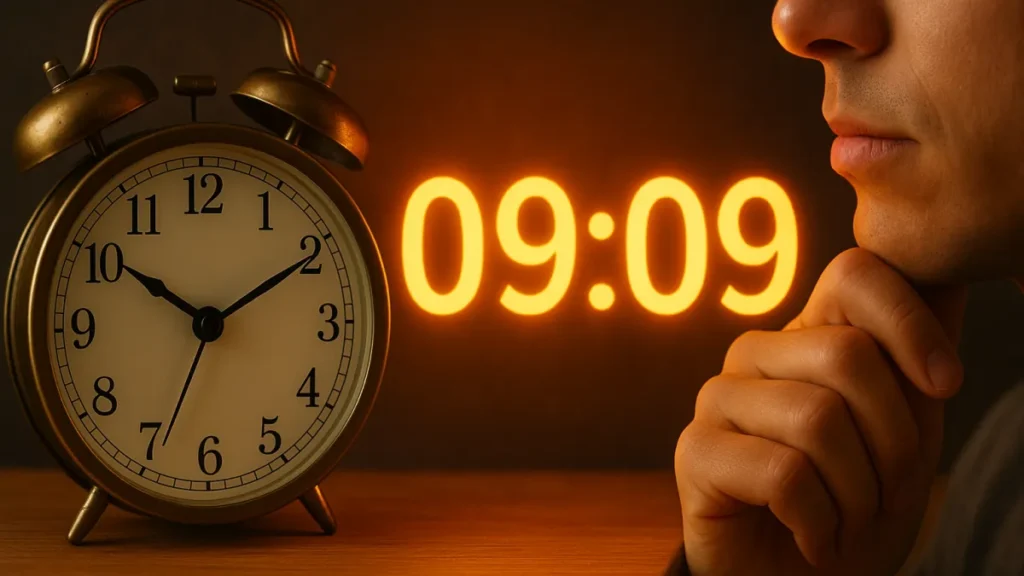 09:09 é um caso típico de hora espelho. Esses espelhos numéricos costumam ser associados a mensagens internas, anjos ou avisos do subconsciente.